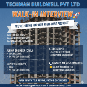 🏗️ Techman Buildwell Pvt Ltd – WALK-IN INTERVIEW 🚀Date: 04 Oct 2025Venue: Moti Residency, Rajnagar Ext., Ghaziabad We’re Hiring for …